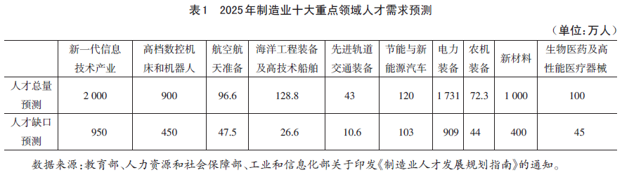新时代背景下,围绕国家重大发展战略,实体经济、数字经济的发展对高素质技术技能人才培养提出了新需求。《中华人民共和国国民经济和社会发展第十四个五年规划和2035年远景目标纲要》(以下简称“十四五”规划)首次提出加快建设以实体经济为第一要义的现代产业体系。制造业作为实体经济的主体,是国家经济命脉所系。在新工业革命背景下,岗位劳动性质日益复杂,只具备简单重复性技能操作能力的劳动者将被机器取代,重点领域需要更多的高端复合型技术技能人才(表1)。